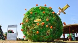 Изюминкой этого сезона стал соломенный коронавирус. Авторы арт-объекта проткнули клетку вируса мечом, на котором написано "российский иммунитет".